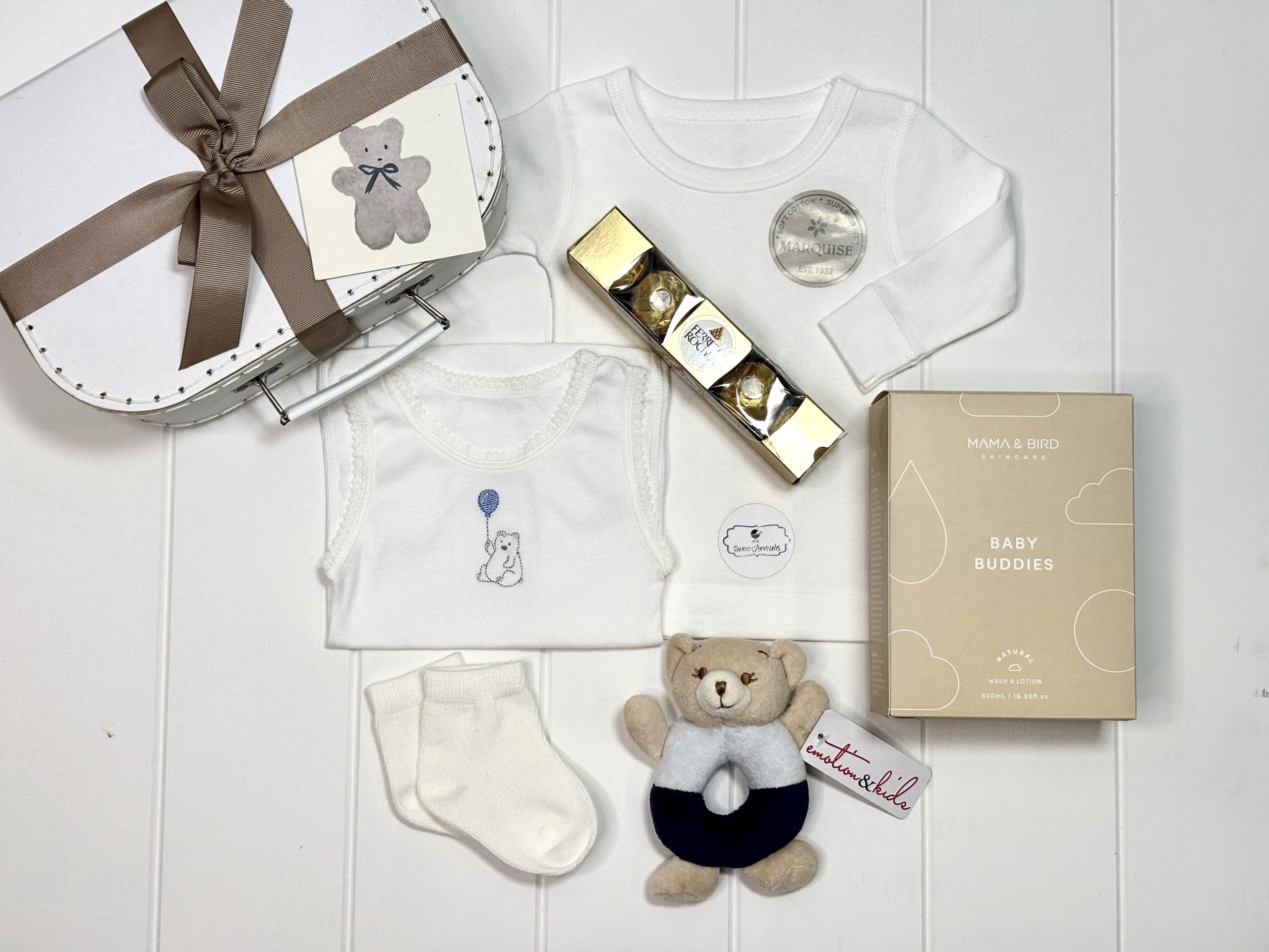 This Baby Hamper is all packed in a vintage style keepsake suitcase with matching ribbon.