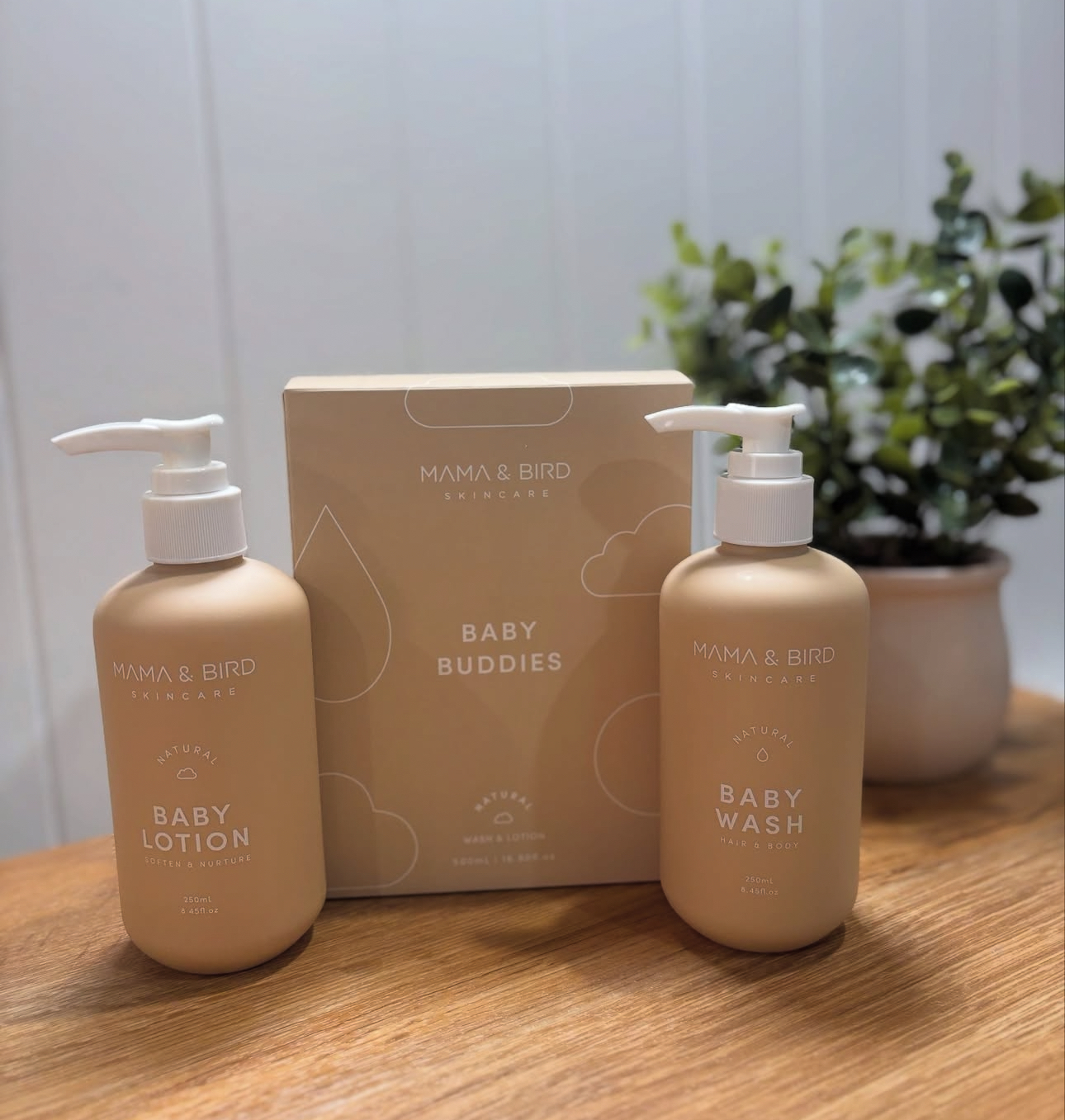 - Mama & Bird Baby Buddie Duo-A gentle daily use duo created to lovingly care for your little ones skin.Baby Wash – Create a calming bath time experience with our gentle daily use hair and body wash. Nurturing natural oils and extracts work together to tenderly clean and condition the skin. Our soap-free wash gently cleanses, without stripping the skin of its natural moisture and oils.